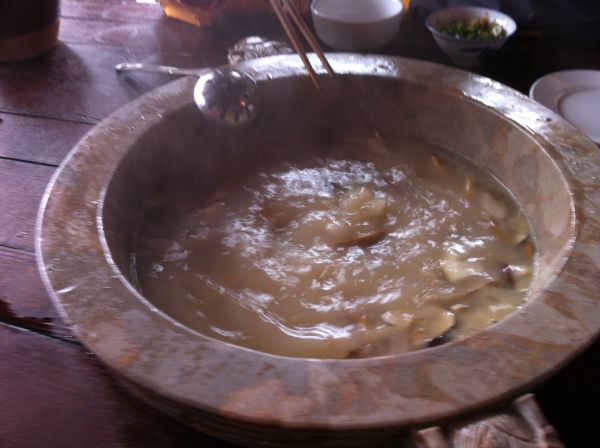 从机场到丽江古城有22公里,包车费是80元,从丽江市一中的口进入古城不远就到了花开彼岸客栈,因为一般机动车都不能进入古城,客栈离古城出口较近才能偶尔开车进入,这样也免得我们拖着重重的行李在石板铺成的道路上颠簸了。进入客栈,放下行李,定下明天去拉市海和后天去玉龙雪山的行程,差不多到晚饭的点了,老板介绍在四方庙会有家石锅鱼蛮好吃,于是直奔美食而去。我们点了石锅山鸡野生菌套餐,价格是198元,火锅吃法,有各种野生菌、还有海带、豆芽和青菜,锅底是鸡汤,在一个石锅底下通入蒸汽,用蒸汽通入汤里将其加热,另外还配有煎土豆饭,整个套餐味道很好,分量足够一家三口吃,买单时跟老板说是花开彼岸介绍来的,打了个9折,178元搞定。