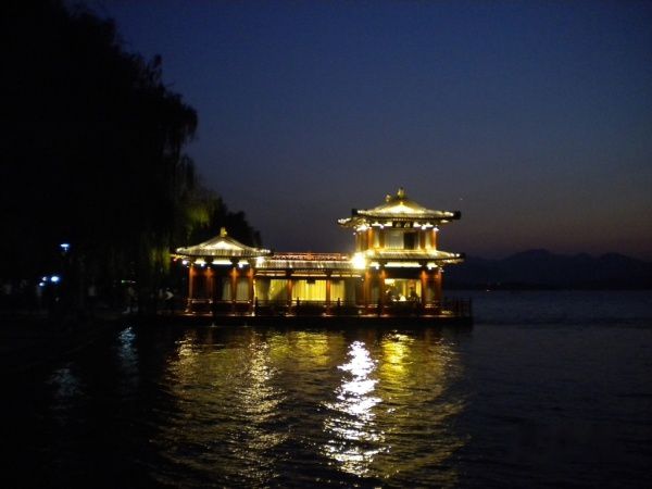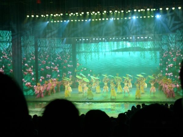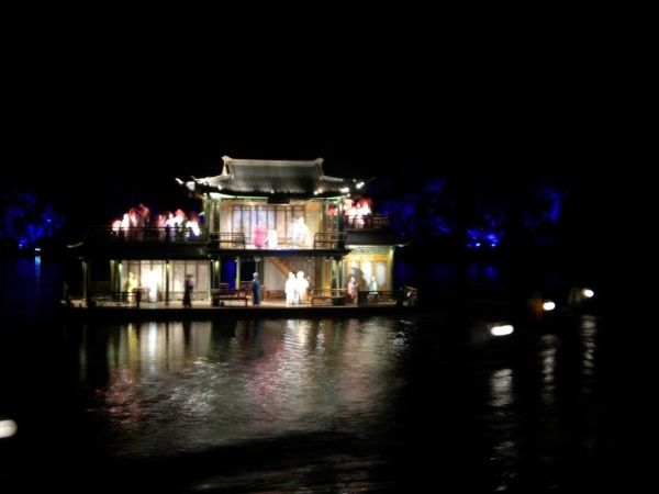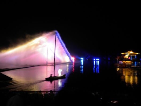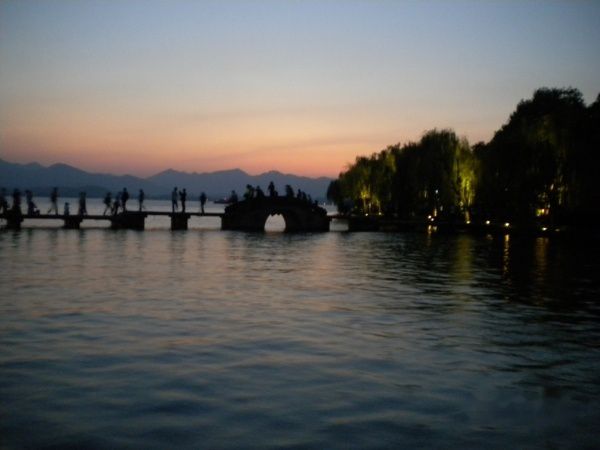 晚上在清河坊边上的面馆吃了饭,就沿着西湖走了大半圈,约一个半小时,到岳湖景区去看张艺谋、王潮歌、樊跃导演的《印象西湖》。21点15分,演出开始,当一束追光射在湖面上,身着白衫,手持绿伞,疾步踏水而来的许仙出现在眼前时,我还是被震撼了一下。我是头一次看到这种在水面上的表演,很是惊讶!整场演出很柔美,看着眼前的树、水、人在灯光的照射下,不断变换着景色,心中有一种感动,但是感觉这台演出不如千古情。本来很古典的故事加上了现代一些元素,但没有搭配好,就像穿着旗袍,上面缀着的不是盘扣而是塑料扣似的,有点味道不正、不纯,特别是音乐,怪怪的。虽说喜多郎是世界大师,但我认为外国人是理解不了中国文化精髓的,让他们来编曲简直是乱弹琴!