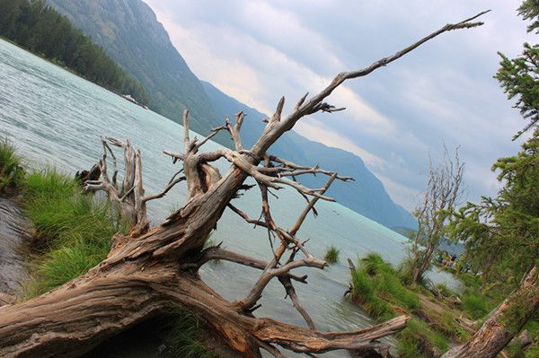 下来后又换乘另一种区间车到湖边。(我的天啊,怎么要换这么多区间车,要是有时间我就慢慢走着了)下了车,走一小段林荫路,看到了另一个喀纳斯湖,远处的湖面还是一样的平静,近处的湖水却用力地拍打着湖岸,我原以为看看湖就走,所以逗留的时间有些长,不知原来还可以沿着湖岸慢慢地走回搭车的地方。