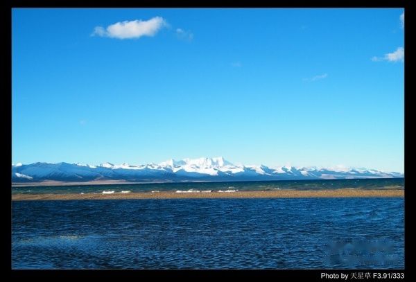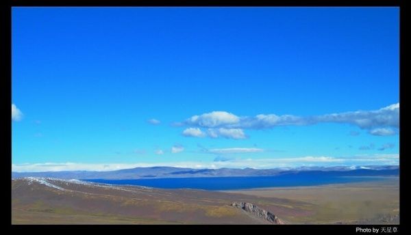 车子翻过雪山后驶向一片比较开阔平坦的原野,路上有一两道车子碾过的痕迹,在洁白的雪地里是那么的刺目明显,就如一道伤疤,刮破了冰雪美人无暇的脸孔。或许我不应该打扰她刚刚安睡的梦境,可是我那么老远的跑来,就不是为了揭开她神秘的面纱吗?就为了这一己私欲,我没有停下脚步,人啊,有时候真的很自私。不多久,远远的天边出现了一抹深蓝的颜色,在银装素裹的雪山围绕下像一只蓝蓝的眼睛,神圣而安详,迷人而忧伤,我知道,她的名字就叫——纳木错。