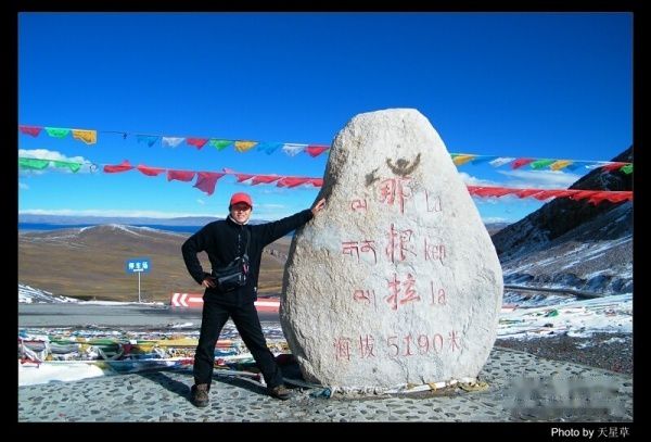 经过一大片草原以后,车子开始上山了。又过了一段时间,当我回头看见纳木错成为天边的那一抹蓝时,我知道,昨天就是在这里第一眼看到了她,同时,也意味着这是我最后能看到她的地方,这地方就是那根拉山口,通往纳木错的必经之地,并且是最高点。昨天由于下着雨雪看不到,今天天气晴朗,所以小伙子让我们下车游览一下。我们可兴奋了,立刻让石碑为我们作证,证明我们曾经来过这生命的禁区。