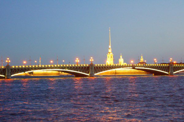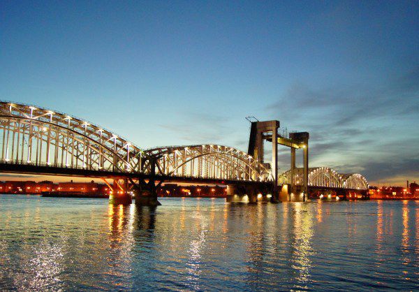 三位一体桥。建于1903年,位于彼得保罗要塞旁。是圣彼得堡最著名的开启桥之一。大桥是六跨度的铸铁桥,桥上有华丽的铸铁灯饰。