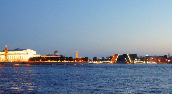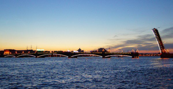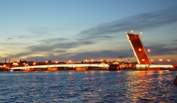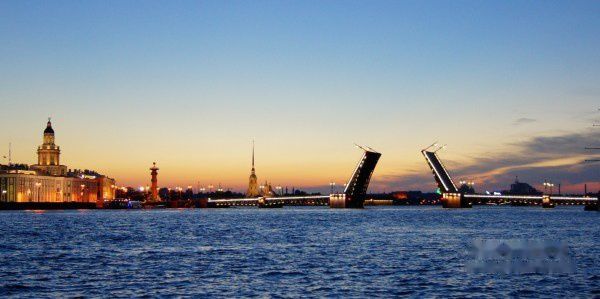 圣彼得堡有“北方威尼斯”之称,全城有340多座桥,水域的面积超过百分之十。每年从5月初到7月末是圣彼得堡最好的季节,在这个季节你会分不清晚霞和朝霞,因为晚霞还没退净朝霞就已出现,河边整夜都有喝酒的闲人、散步的情人、钓鱼的老人、欢乐的年轻人。圣彼得堡更独特的风景是每天夜晚涅瓦河上的桥按照从下游往上游的顺序依次开启,好让大船从海口驶入市内,同时让迎面而来的商船驶入芬兰湾。