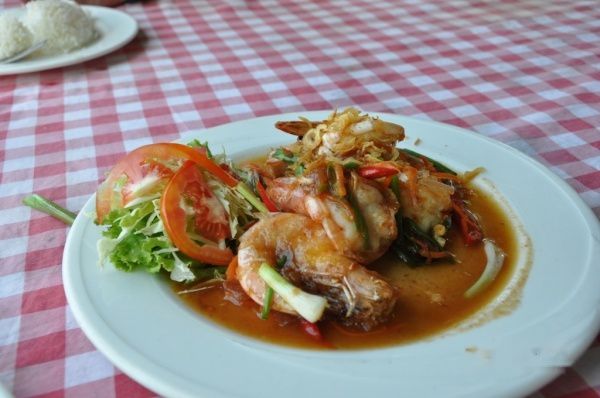 沿着海滩街后面的一条大街开始逛,吃的地方不少,不过海鲜都是死的,就没有进去吃,差不多又逛了半小时,终于看到一家有卖活龙虾的店了,还是中国人开的,上书巴东海鲜餐厅几个大字,老板殷情的招呼我们坐下,福建人,介绍龙虾300B/100g,感觉贵了,但是老板说大家都是中国人,不会斩我们的,加上也走累了,就在这里吃好了,不过事实证明,在国外千万不要去中国人开的店,语言相同才更好斩,第二天我们在PATONG SEAFOOD RESTAURANT看到一样的活龙虾只有215B/100g,而且秤是准的,不用特意象这里要和老板说把秤调调准,看到这篇游记的同学希望你们再也不要去光顾这家饭店了。