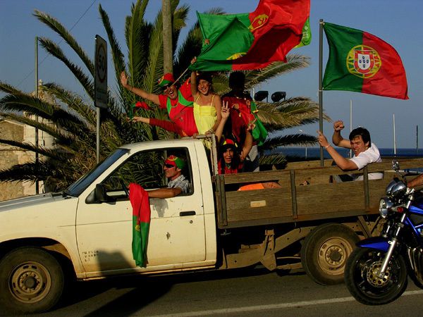 千 万双眼睛注视的球赛终于以葡萄牙的胜利而结束了!人们欢呼雀跃,从咖啡和酒吧里走向广场,拿出国旗和各种带有国旗标志的饰品,相互庆祝!万人空巷的室外即 刻热闹非凡,满眼红和绿的海洋,满耳“葡萄牙”的叫嚷且夹杂着喇叭的声音。公路上,自发的游行开始了。各种车辆打着迎风飘舞的国旗,自豪地漫步在夏日的骄 阳下。有人热情更胜,竟坐在吉普的挡风玻璃处,高举标语,激动地呐喊着。我虽是门外汉,也被这热情感染,在他们的带领下卖力的用葡萄牙语喊着。每个人的脸 上都洋溢着成堆的笑容,发自内心,魅力非凡!当然,有得必有失。在葡萄牙渡假的英国人和当地人打了起来,很快被劝开了。英国也是足球的宠儿,无奈这次败 北,可以理解。