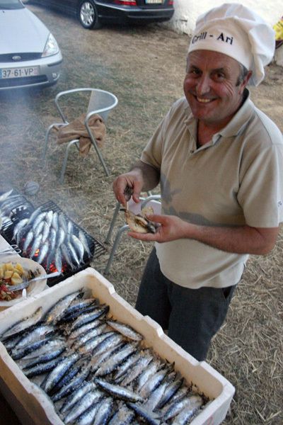 艰 辛万难,终于回到别院。在夕阳下走上别院那蜿蜒小径,颇感牛仔探险后的豪情。丰盛的晚餐随即开始。Inish的父母也加入了,爸爸特地带了几箱刚捞上的沙 丁。这些银色的小生物整齐的排在箱子里,周身撒满了美味的海盐,眸子晶莹,色彩明亮,迫不及待的为我们服务!Inish爸爸快乐的带着“主厨”帽,为我们 提供专业的烧烤服务。光看照片里烤架上鱼的码放方式,就知道当地人真是个中好手!炉火正旺,黄白色的海盐融入鱼生,鱼的油膏滑落在炭火上,滋滋作响。配以 蔬菜,水果和土豆,我们迫不及待地开动了!鱼肉鲜美肥润,咸淡适宜,一点腥味儿都没有。Inish妈妈本身胃口不大,但每次吃鱼能吃掉二十条,实在是太美 味了!大自然真是高杆的厨师,本色食材比奢华料理更胜一筹!而这里的人们真的知道怎样“物尽所用”。