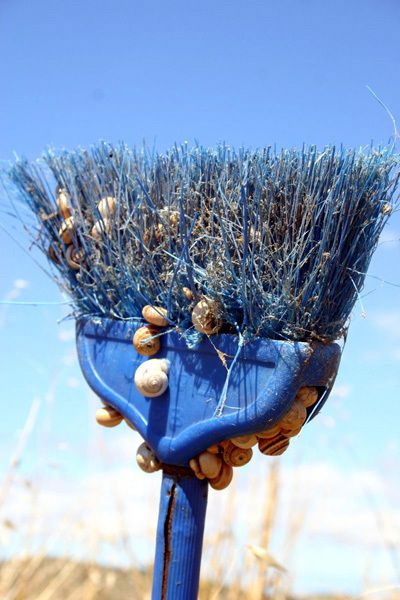 昨 晚大家又闹到很晚,于是今天在别院调整。太阳把帐篷烤得暖暖的,一睁眼就看到蜗牛在帐篷上爬。这里的蜗牛大都是白色或带小花纹的,比北京的要勤劳。每天早 上都会成群结队地努力寻找阴凉来躲避烈日。这不,即使小小的扫把也不放过。蓝白相间的扫把也颇有地中海味道了。不禁思量:“地中海”风格到底是人们定义的 呢,还是大自然在此区域特别设计呢?