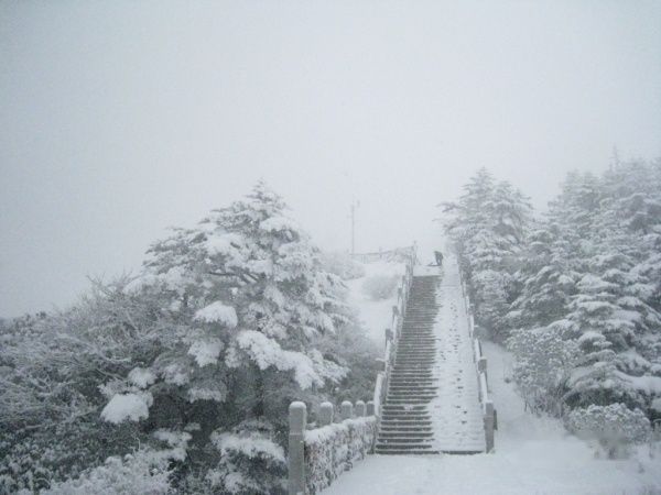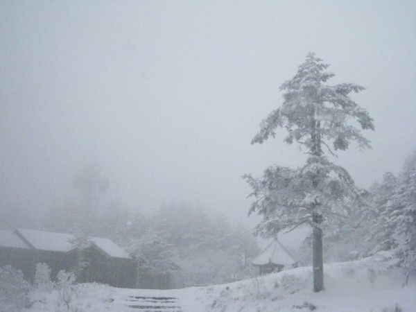 冬天接引殿至金顶的索道最早的是7点40。7点半我走出宾馆大门却目瞪口呆:真没见过这么大的雪。前方十步以外的人,就只能看见一个模糊的黑影,所有的景物看上去都不真实了,和没带眼镜看到的效果一样。我心里很崩溃,这样的天气,不要说日出,可能连附近的山峰都看不到了。