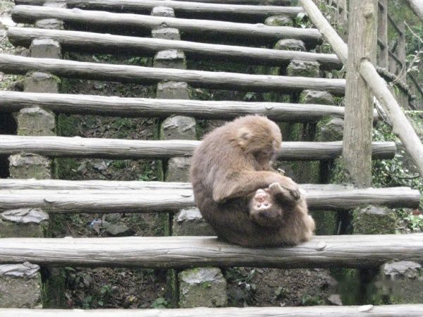 猴区其实并不是登山的必经之路,只是在山路旁修的一段200米左右的木栈道,栈道上,两边的木桩上,二十几只猴儿或卧或坐。我把背包拉链扣藏到拉链里,戴上帽子,又把相机缠到手腕上塞到袖子里,这才小心翼翼地凑过去。一只好大的猴儿突然窜过来,抱着我的腿不放,旁边的当地妇女忙告诉我这是猴王,必须给吃的不然不让过,又让我买她手里5元一包的苞米。我本想拿口袋里的饼干出来,她却又说这里不可以自带食物喂食,我只好赏了这猴儿一包苞米,猴儿拿到苞米后就闪到一边吃去了。旁边妇女趁机又想让我再买,说可以陪我走到栈道尽头,这样猴子不会来欺负我。这样的勒索我可不愿意接受,没答应她自己慢慢往前走,却看见两只猴儿已经蹲到我面前栈道两旁的木桩上,一左一右虎视眈眈瞅着我。我有点儿紧张,心想这俩猴儿莫非还想一起扑到我身上来?正琢磨着,先前那猴王又窜过来抱住我了~~我心说这还没完了,用竹竿轻轻推它,也不走。爱走不走,我也不管它了,拿出来相机取景照相。之前准备行程,看网上说千万不要在猴区照相,也不要看猴子的眼睛,以免激发它的兽性,这两点我也都顾虑到了,可既然现在看来也没那么夸张,我也实在想用相机将所见之景记录下来,就小心地照了不少。再远一点儿的栈道上还坐着一对猴儿母子,母猴儿将小猴儿抱在怀中,似乎是在抓虱子之类的,小猴儿躺着,脑袋却仰向我这边,眼睛滴溜溜地瞧着我,十分可爱,我也将这幅慈母舐子图照了下来。