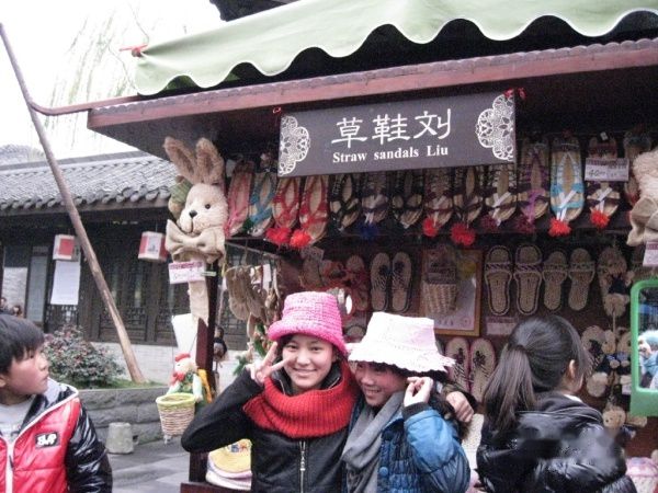 出武侯祠左拐,紧挨着的就是锦里。觉得锦里是我见过最喜欢的民风民俗商业街了,两旁店铺多而不乱,最难得的是把吹糖人、剪纸、面塑等民俗工艺设成单独的门面,店面大小不一,却使用同样的红底祥云招牌,注明此工艺的中英文,一路看下去绝不重样,还有很多我没听说过的,钩钩针、棕编、喜神链、蛋壳画等等。见到两个可爱的藏族小姑娘在家草鞋刘(草鞋刘…果然入乡随俗)前照相,我也在旁边给她俩照了张,还成功把小姑娘的目光吸引过来~~~
