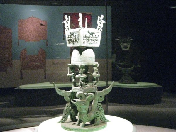 较为重要的文物都以单独的展台展出,后面附有详细介绍,灯光也和其他博物馆一样打得刚好。大立人像和纵目人像与之前看的图片差不多,比想象要更大一些。印象最深的是一尊分为三层的青铜神坛,底层是一对头尾相向的神兽,中层为四立人和头顶的山峰,上层有建筑和人像、飞鸟造型,建筑之间还有人首鸟身的造型,从上自下各代表天、地、人三界,器物设计的精美流畅,令人叹为观止。