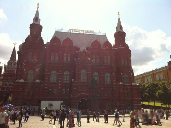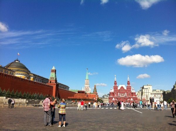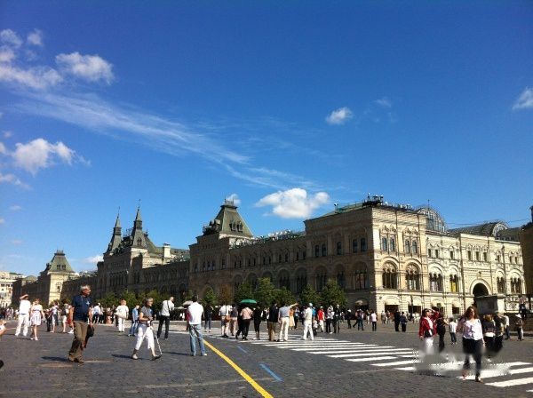 红场大约只有天安门广场的1/5。地面很独特全部由条石铺成,显得古老而神圣。红场原名是"托尔格",意为"集市"。1662年改为"红场",古语为"美丽的广场"。阳光明媚、蓝天无垠、清风徐徐,红场看起来相当宽阔有气势,广场上随处可见悠闲散步的鸽子。