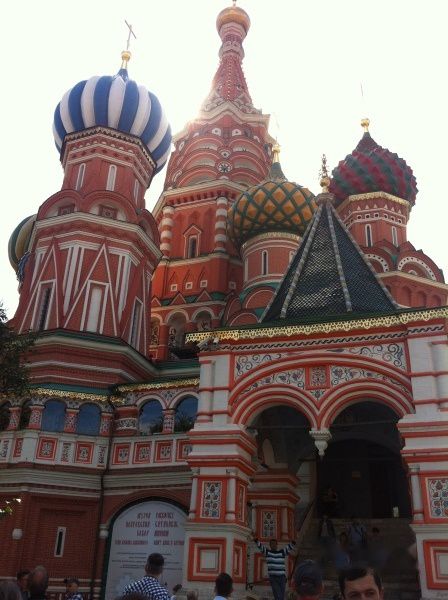 瓦西里升天大教堂,又名波克罗夫大教堂。它是伊凡雷帝为了纪念1552年战胜喀山鞑靼军队而下令建筑的。当你看到这座教堂,将会被它独特的建筑风格所吸引。这座教堂中间是一个带有大尖顶的教堂冠,8个带有不同色彩和花纹的小圆顶错落有致的分布在它的周围,再配上九个金色洋葱头状的教堂顶,绝妙无比。伊凡雷帝为了别处不再出现这样美丽的教堂,下令弄瞎了建筑师的双眼。可怜的建筑师! 瓦西里升天大教堂前面是民族英雄米宁和波扎尔斯基雕像(1818年雕像落成)。1611年至1612 年,他们打败了波兰侵略军,解放了莫斯科。 教堂前是一个圆形的平台,俗称断头台,是当年向群众说教和宣读沙皇令的地方。同时也是行极刑的地方,行刑是在台下进行,在台上宣读处死令和犯人罪状。往台里面投几个硬币向冤死鬼默哀!真没想到这么美丽的建筑居然是做这个的, 吃惊之余,也投了几个硬币,希望所有的灵魂都升入天堂……