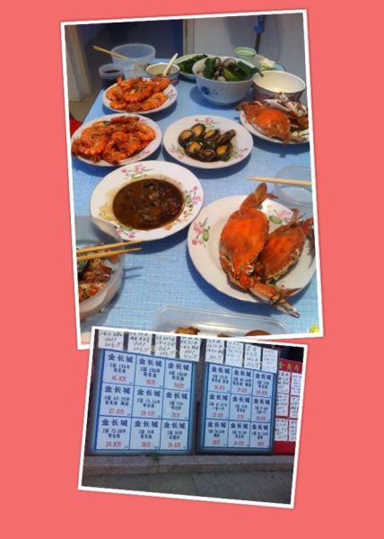 银滩的大姆指哦,那是银滩的中心。晚上也只有些许昏暗的路灯,要想在海边走走那可一定要带上一个亮点的手电!总之,常住那的也就是原镇上的一些渔民。景也是原生态,只有破坏没有保护!到处是垃圾!不过海鲜不错!我们到当地的菜场买了四个大螃蟹(120元),1.7斤九节虾(100元),二只海参(30元),8个鲍鱼(32元),二斤花蛤(10元),蔬菜其他(10元)。东西新鲜好吃,一顿吃下来还剩下很多虾,剥好放着隔日早餐煮上一大锅海鲜粥,吃得那个舒服!
