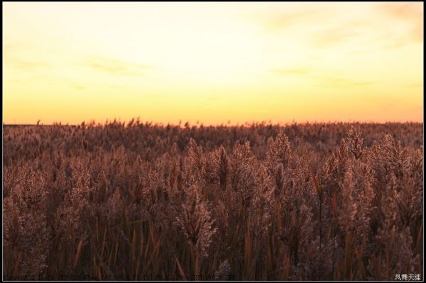 占据了有利地形,我们翘首东方,等待着那红日喷薄而出的壮观。远方的地平线上,一抹朝霞渐渐升起,如画笔晕染在宣纸上,慢慢的浸红了半边天。在越来越盛、越来越亮丽的云霞围绕下,出现一道耀眼的弧线,瞬间照亮了面前的芦苇荡。眨眼功夫,太阳露出了它红彤彤的脸庞,转瞬就变为橘红色,发散着耀眼的光芒。而朝阳洒在连绵的芦苇荡上,果然是金色的耀目,氤氲着一层金灿灿的光晕,透着神圣的光辉,美到让人感到窒息。虽然气温低到冻得手僵,我们却都兴奋的按动着快门,舍不得放过这瞬间的美丽。而那帮80后极尽搞怪之能事,照相一个比一个夸张。摆着千手观音的造型,朝阳为她们披上霞衣,如此的青春四射。感慨年轻就是好啊,魅力是油然而生的。虽然我们贪恋美景,虽然还想多逗留,但是由于明日汽车票出发时间提前,必须在一天内将主景区走完,只能赶紧的招呼大家上车,返回驻地,返回额济纳,去看胡杨林。