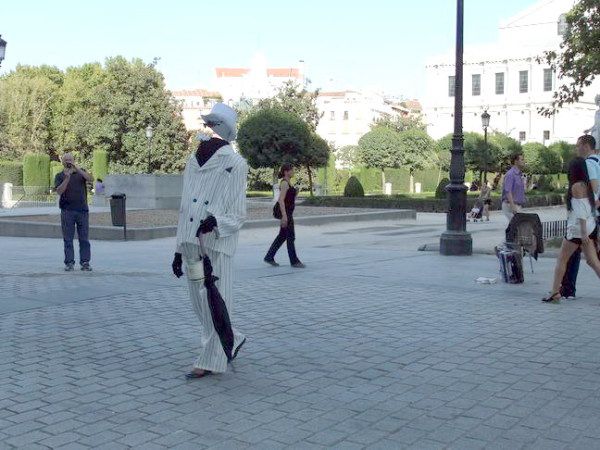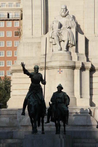 因为已经6点多了,还要去西班牙广场和普拉多博物馆。西班牙广场离大王宫花园只需走10分钟,原以为这么有名的广场不定多大呢,没想到还不如北京的街心公园大,最著名的就是《堂吉诃德》的作者塞万提斯和他创造的人物堂吉诃德、仆人桑丘的塑像
