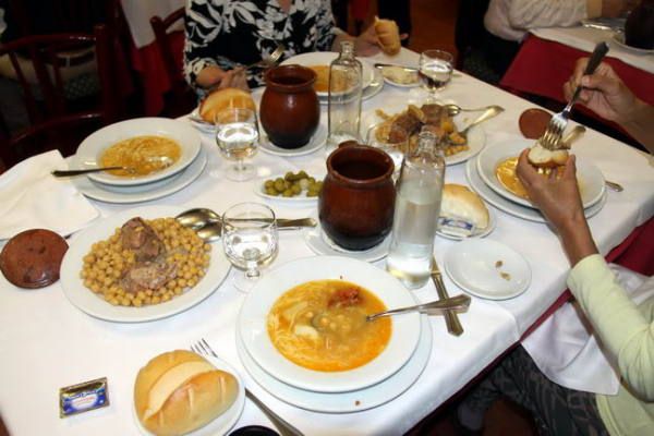 餐馆不是很大,我们进去不久,桌子就都坐满了,据说许多都是慕名而来的外国游客。服务员把我们领到一张餐桌前,我们旁边的一桌是9位中国客人,来自上海和台湾。我们点了两份马德里肉汤(每份19.5欧),两瓶矿泉水,一碟腌橄榄,外加4个面包,4块黄油