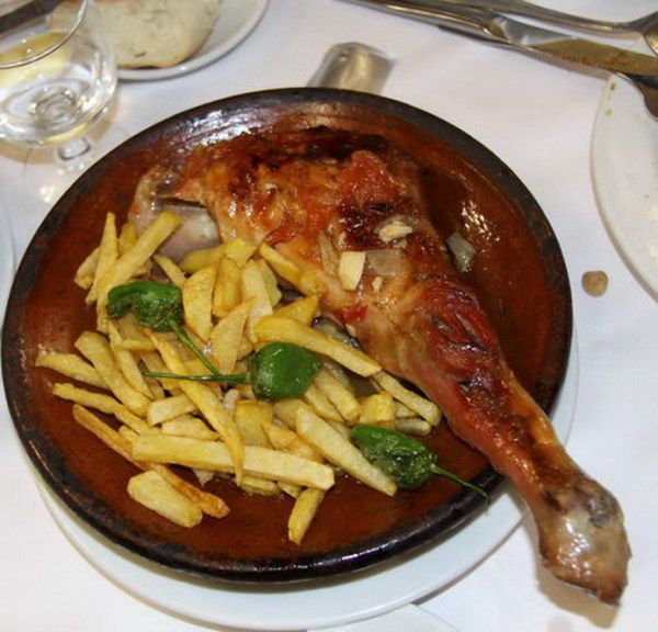 马德里肉汤是盛在瓦罐里端上来的,拿到餐桌上再倒在盘子里。不知别人怎么看,我并没觉得这肉汤有多好吃。倒是吃完肉汤又要的本店名菜烤羊腿(好像1份20欧多点)让我们赞不绝口,它鲜肥酥烂,吃进嘴里满口鲜香。我们本已吃得差不多饱了,以为得剩下一些呢,没想到竟吃个精光。