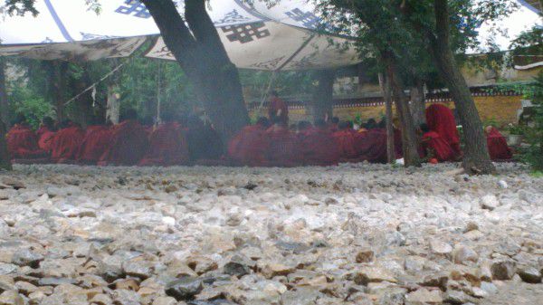 参观完大殿,我们顺道一条陡直的小道,来到一处偏僻的小院落,指示牌上写着“辩经场”,因为是很严肃的考试,次仁顿珠示意我们不要打扰到僧人,安静地坐到门口观看。院子里的大树间挂上遮雨的帐布,煨桑的白烟不时飘到帐布里,僧人们分二边对坐,经师坐在主位,辩经的双方则在大家的见证下问答。天空好像为了应景,降下了轻轻的小雨,让僧人们的击掌声、问答声更显空灵。虽然听不懂他们问答的内容,但从每一次的击掌和问答中能够感受到他们的信念。尽管是夏季,雨水却是冰冰的,有着冬的寒意,对辩的双方并没有受到影响,依旧针锋相对,使我们不得不佩服信仰的力量。辩经是藏传佛教中最有特色的传统,次仁顿珠很专心地听着辩经,即使辩经使用的是藏语,藏族人也不见得完全听懂,但我还是试着问次仁顿珠问答的内容,他只是笑笑,看来是只可意会难以言传的。不过这就是一种仪式,僧人可以从中领悟佛法的深意,听者可以从中体会到神灵的力量,无论是谁,都能从中使自己变得更强大。