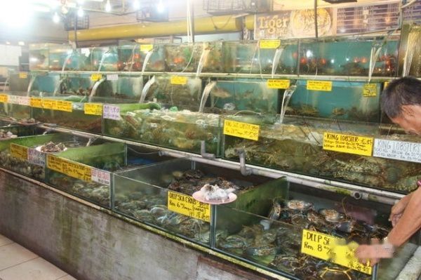 海鲜市场在一个大棚里,有四五家店。每家店的柜台前都有很多养着鱼、虾、蟹、蛤、螺等各种海鲜的水箱,每个水箱上有一个价签,客人可以看着实物直接点,