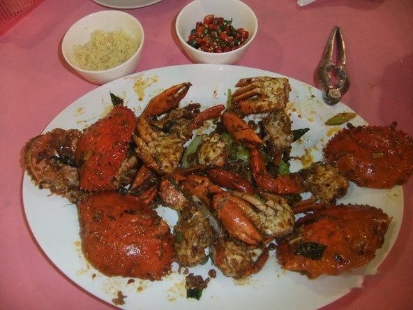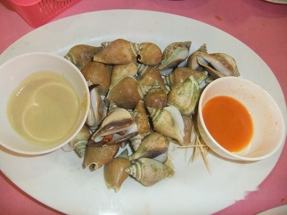 点完由店家拿到后厨加工,加工后就可以在这里的餐桌享用了。我们先点了3只从没听说过的软壳蟹,(这种蟹的壳软软的,做好了可以连壳带肉一起吃),又点了两斤青蟹,4斤小海螺,一共68.8马币。