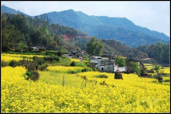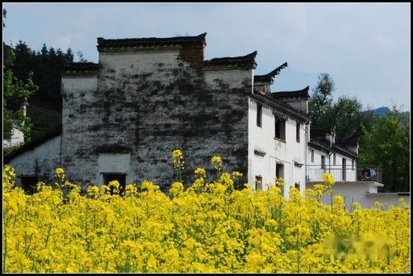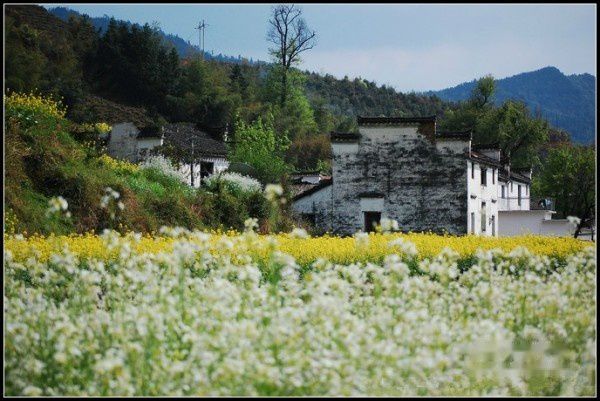 白色的萝卜花、金色的油菜花、绿色的树木,灰白色的徽派建筑