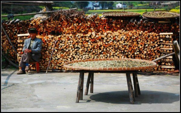 恰是午后休息时间,外汪槎村子里格外安静。走到一个平台上,只见三三两两的竹筛上晒着菜干,一位老大爷坐在木头堆旁边休憩。在如此安静的世外桃源,我们就像是一群不速之客,打破了这里的宁静。