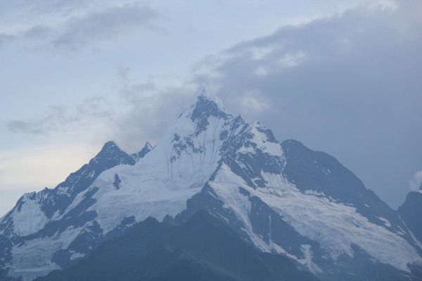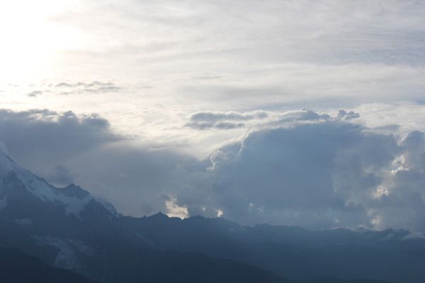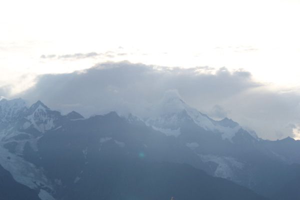 7月29号下午1点从天津出发,5个小时飞到昆明,然后马不停蹄地赶到香格里拉,已是7月30号上午9点多了;买了张去德钦的车票,那山路啊——中午12点跑到黄昏6点半;到了德钦正赶上一辆去飞来寺的班车(可能是最后一辆),待到飞来寺,白云正浓时;照了几张梅里雪山的黄昏照,然后找了个旅馆,随便吃了点东西洗个热水澡,立马休息,明天还得徒步上雨崩。