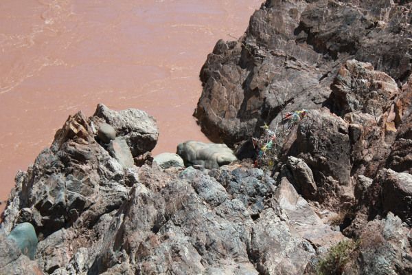 果然是望山跑死马,又走了1个小时左右,却觉得西当离我越来越远,更不幸的事,水快喝光了(上山一定多带水,到了山上,水的价格陡增,是山下的3~4倍)……善良的藏族同胞啊,总是在我们需要帮助的时候挺身而出,嘿嘿;搭上藏族大哥的顺路车(不要钱,真的是顺路车),他们去巴久寺朝拜,而我也正好观览了一下那座寺庙。藏族大哥汉语说得很好,免费当导游,我都不知道该怎么感谢他了。他很详细地给我介绍了巴久寺的历史并带我参观这座寺庙(遗憾的是当时竟然忘记了记录);前面的藏族阿妈按照一定的顺序在寺庙内外行走,我怕弄错了顺序亵渎了神明,所以只是立在一边看。(由于本人认为拍照也是对神明的不敬,所以没有留下巴久寺的照片,唯一拍照留念的是据巴久寺不远的水葬石——中间那块光滑的石头就是;这里也是德钦县唯一一处藏族同胞进行水葬的地方)