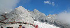 7/24,今天将是最好玩的一天。因为我们即将要登东方的阿尔卑斯山——玉龙雪山。早早大家准装出发,这里的天更蓝,气温适中,我们一路穿梭于高山绿水之间,来到了第一站——玉水寨。这里在山脚下,是东巴教圣地。抬头云雾缭绕的高山成群,低头清澈见底的溪水流淌,成群的红色三文鱼随处可见,一副世外桃源的景象。游客络绎不绝,欣赏地这如仙如画地美丽景色,让我们流连忘返。第二站就是我们盼望已久的玉龙雪山。我们一路换乘车,向更高处迈进,顿感有些呼吸不畅,耳朵疼痛,当然气温逐降,来到海拔3356米高处,难免都有些高原反应。游客们纷纷都租上了羽绒服,寒冷难耐。女儿也耐不住,我租了一大袍给她。在这乘览车可直接到达玉龙山高处4506米。十多分钟的览程,让我们在云雾中穿梭,脚下已是万丈深渊,不免让我后怕,女儿却是兴奋不已。4506米是目前玉龙雪山最高的一平台,站在这,呼吸已极不舒畅,体力消耗很大,气温寒冷,随处可见都是穿着红色的羽绒大衣的游客。抬头就是眼前的玉龙山顶,一片雪白,在蓝天的衬托下,更是雄伟。有些有劲的“红色羽绒服大衣”沿着山路还在不断攀登,犹如一条红绸带,在雪白的山上更是显眼,漂亮。短暂的美景却被突来的一大片云雾所阻挡,顿时什么都看不到,后来上来的游客不免失望而归。哈。。。幸亏来的早