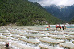 下午我们去了白水河、蓝月谷。这里在山脚下,远处高山林立,云雾缭绕,近处绿树成阴,白水河一层一层很浅,水从高处一一留下,清澈见底,在阳光下,更是闪闪发光。游客骑在牦牛上在白水河里漫步拍照,很有亮点。