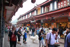 丽江古城,则是今天的最后一站。这里一个词可形容,人山人海。有名的四方街,古色古香,人随溪走,各式各样的丽江特色小店遍布四周,不时还能传来这里特色的手鼓音乐,很特别,很好听。别具特色的酒吧一条街,花红柳绿的装扮,激情地放着丽江特有的音乐,吸引了来自五湖四海的游客。环游古城的同时,不忘买些特色的小吃,边吃边逛,漂亮的披肩拿手披来,呵。。。转眼已是大包小包的一大堆。