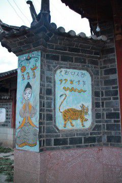 一路颠簸,晚上才到丽江,地陪导游俗称“潘金妹”。晚餐在丽江农家乐享用,正好碰到台湾团正在跟当地的村民大过火把节(这几天正好是丽江火把节),一起围着火盆跳舞唱歌,别提多热闹了,很有气氛。虽说都是些当地老太太,但那跳舞的身姿可灵活着呢,一点看不出那年龄,女儿一直拉着我想要加入其中,呵。。。感受当地的风俗。这里的房子也很有当地纳西特色,东巴文写满了屋外的墙壁,很是特别。