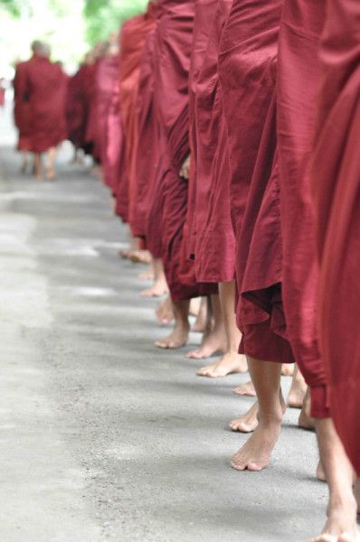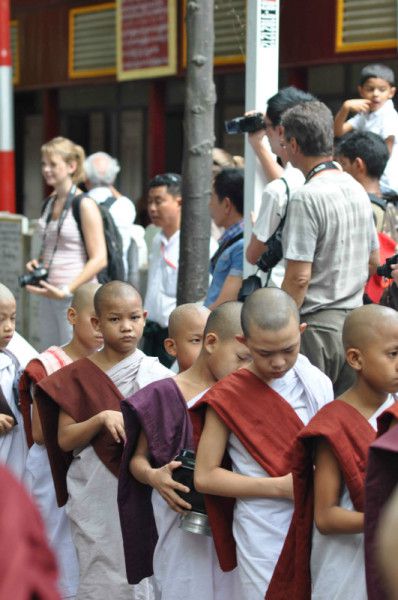 饭厅里是不能去的,和尚们依序安静地围坐在四方饭桌周围,饭食看起来很丰富,有整桌的菜,他们无声地吃饭。这让我想起了农家婚宴客堂的景象,很相似,只是少了鼎沸的人声。不过换位思考下,和尚们吃顿饭还要被围观拍照,是不是我们寻常人的心态太过猎奇?先吃完饭的和尚们从另一道门出,走向他们的宿舍区,他们的鞋子整齐地放在由碑刻围成的院墙下,观光客只能在道路入口远观,于是一群猎奇的人们又对着和尚们的背影拍个不停。看来围观是不分种族和肤色的,可能这样一个简单的生活场景在东西方人眼里都变得不同寻常。有出售关于缅甸的宗教类书籍出现在饭堂外,不过看不懂缅文,我们转到厨房后面看看,有和尚在洗衣服,当有人举起相机时,他摇手示意不同意,于是没人再拍。有炒菜的和尚,站在高高的灶台前挥舞着铁铲,翻动着锅里的菜,还有和尚们在用木板围成的矮墙后用水冲洗自己,走了一圈,觉得这里的生活环境很好,绿树环绕,住宅都掩映在浓密的树荫下,种种迹象更象是一所宗教学院。