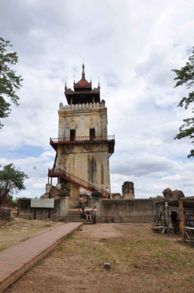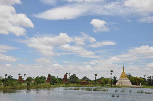 饭毕,雇了位老伯的马车向村里进发。老伯问我们来自何方,我们说:China.老伯举起大拇指说:China, good.我们无法用语言更多沟通,只能抱以微笑表示感谢。村里有缅甸的牛,白色,背部长有很高的驼,刚好可以担住车架,苦命的牛!古城废墟有四个景点,有塔有殿有寺庙,道路两边是湿地和水面,很多田地里没有庄稼,有些是荒废了,不知为何?村中有所小学校,门口写有基础教育学校字样,孩子们在上课,传出阵阵读书声。废墟周围很多乌鸦,个头很大,据说是缅甸人的神鸟,寺庙要出示进入曼德勒市的外国人通票,10US。不知何故,机场司机没有带我们买,而且庙门口只有检查口没有卖票口,我们转到后面看了看就离开了。在去斜塔的路上,马车跟在两辆法国人雇的车后,扬起尘土迫使我们用上口罩。斜塔歪斜得厉害,陡峭的木楼梯通向上方,由于没有做事前历史了解,看得很不明白。塔下有个画家在卖画作,都是因瓦风景和人物风情,我们返回渡口。