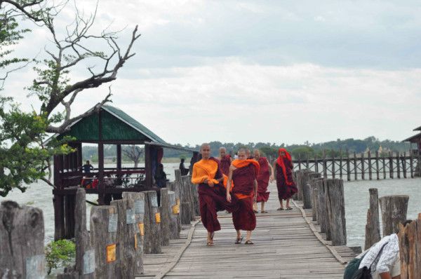 一抬头看见几个缅甸男人在跟我们的司机交谈着,见我们上来,有一人用手指着朋友胸前昂贵的相机,并用不标准的缅式英语说了我们一通。原来他们以为我们欺负了那个老实巴交,不会英语的同行,解释清楚后,他们才哦地一声散开,接着我们返回早上的地点附近,去乌本桥。再次路过事故现场,人群已散,司机远远的就岔道绕开,可能他们也很忌讳吧。几个和尚盘腿坐在高处,中间路面上还留有一些痕迹,家属们低头跪在对面聍听和尚做法事。车子绕道走过,驶入一座寺院院子里,我们走上了乌本桥。计划好要看日落的,可云层低垂,根本看不到太阳,我们走了走,坐了坐。桥面很平整,每隔一段距离就有一座休息厅,可以避江面上很强的横风。放学了,学生们推车过桥,桥上行人们互相避让,感到人很多但却有条不紊。桥长一公里吧,我走了几百米,实在害怕被风刮下,于是就停在休息亭里看东西。等了很久仍不见太阳的影子,我们只好返回客栈。司机说日落得等到7点,而火车是9点。还要回去收东西,我们没有等到日落,不过这一季的天既不蓝又多云,太阳就是不露脸。