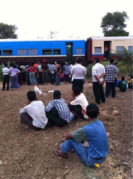 我们在椅子上迷糊到了天亮,估计也就五点来钟吧,乘务员们不时有人上来找工具,然后脱下制服又转身下去了。我们伸出头望下去,车厢外长满了荆棘,有两个男人正在挥舞长刀砍出一条路,他们的手臂上,脚上都有血渍,可能是从路旁村里找来帮忙的吧,前一列车厢下,几名工作人员正在爬进爬出,找东西将车厢垫高,车厢内的乘客们已疏散在铁路一边低矮的土路边,他们静静地围坐在工作人员后面,围观修火车,