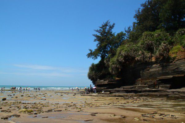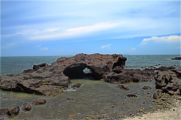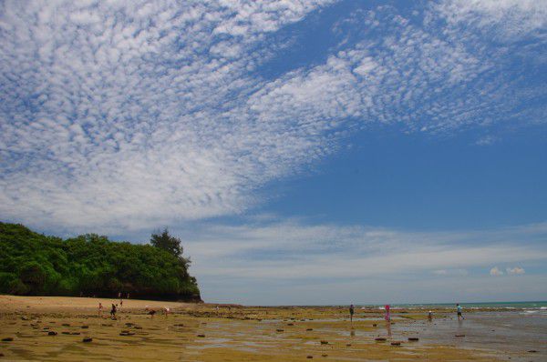 我们快中午的时候去的,感觉海水有点涨上来了,没有完全领略到五彩的岩滩。只是感觉很开阔,旁边山岩倒还可以看出颜色蛮特别,蛮有层次,就是有好多小虫子啊,只可远观不可亵玩焉。据说这里看日出蛮不错的,下次再去的时候要去看看。一段小坡路走得倒也蛮累的,有很多烧烤的摊头,那个香啊,我们没吃饭赶时间所以把我们给馋死了。后来在停车的地方,看到很漂亮的云,好久好久好久没看到过这样的云了。
