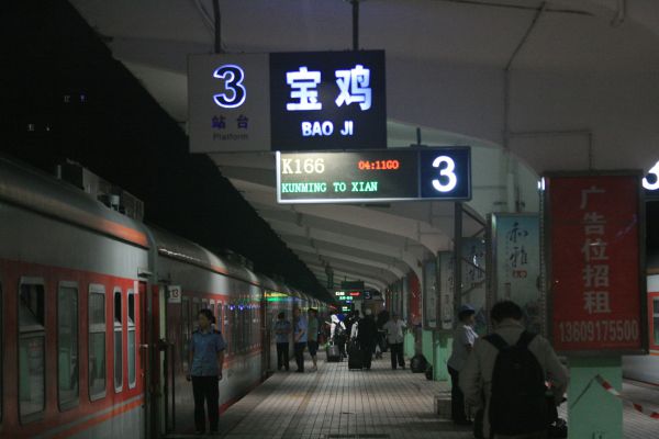 12日,我们坐上K166车,晚点1时,原本13:26开的列车14:30才从成都出发,这是从昆明发往西安的快车。车到绵阳,我俩才都坐上位置。这是我第一次走宝成线,一路经过四川境内的德阳、绵阳、江油、广元,夜色里,列车穿行于陕西的阳平关、略阳和甘肃的徽县,穿越秦岭,于13日凌晨4:30左右抵达宝鸡。算是我第二次站在陕西的土地上(上次是2002年在安康车站停留)。