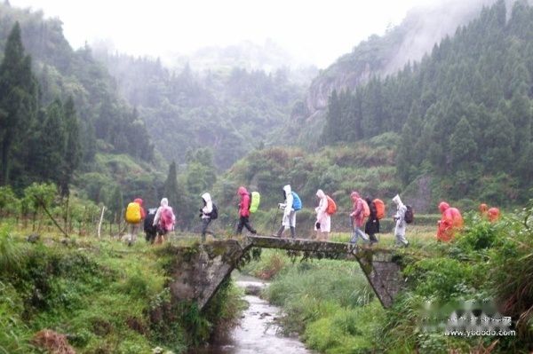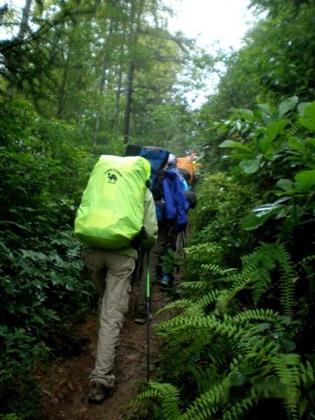 刚吃完早饭,听说高速通了,我们又开心的上路了。本来领队想安排我们去昨天定的旅馆休息两个小时,但是最后投票结果是一半以上的队员选择直接上山。于是我们直接杀到了徒步点,整理好行装,准备出发,可惜天公不作美,刚背上包,便开始下雨,而且越下越大。我们套上雨衣,省略了热身,出发~~