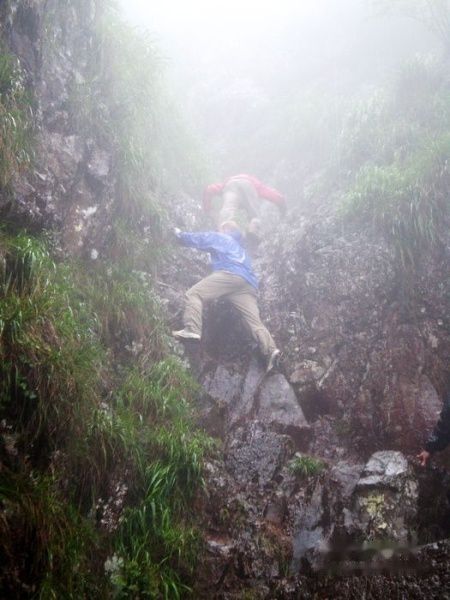 不过刚出发没多久,便又开始飘雨。上公盂背的路相比前面上山的路要难走些,陡,碎石坡多,下过雨后又湿又滑。不过队员都很厉害,都坚持爬到公盂背下。这个时候雨越下越大,上公盂背的悬崖开始成了小瀑布,副领和另外一名队员上去探路,队里有两个老外和另外还有一名有攀岩经验的女队员也上去了,我们其他人就在下面瞻仰了一下。
