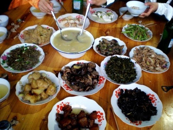 五点多,开始晚饭,老乡一个菜接一个菜的上,菜多,分量足,味道也很好,狂吃狂吃都没吃完~~