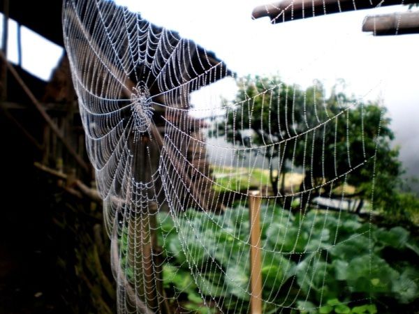 起来刷牙洗脸,排队上厕所,意外发现了厕所外面挂着水滴的蜘蛛网,从侧面看过去晶莹剔透,美极了。正好相机在口袋里,抓起来拍了一张。