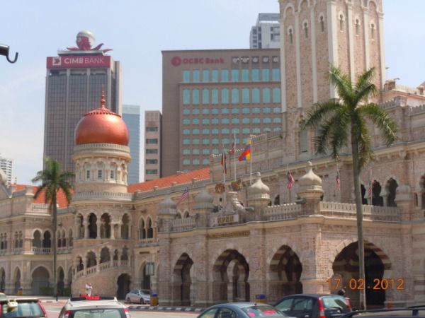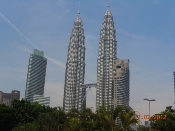 1957年马来西亚脱离英联邦独立,就是在独立广场升起了国旗。绿草茵茵的草坪上一边是荷兰建筑风格的房子,一边是马来清真风格的高等法院大楼。高等法院大楼的中央有一个40米高的钟楼,钟楼的造型类似英国的“大本钟”,但在钟楼的顶部加上一个金色的半球形圆顶。整条街道上车流川流不息,匆匆照完相后我们前往双子塔。今天的天气非常好,蓝天白云,阳光明媚,微风习习,非常舒服。双子塔以前在电视电影里见得多了,今天是亲眼领略它的风采。双子塔高88层,建筑高度有450米,在41和42 楼由一座天桥连接在一起。它是马来西亚国营石油公司的办公大楼。远看双子塔巍峨壮观,气势雄壮,不愧是吉隆坡的地标性建筑。晚上双塔灯光通透,在很远的地方都可以看到,非常夺目。