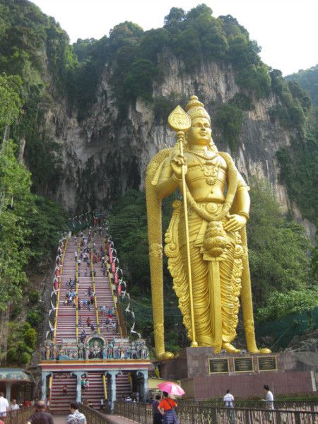 印度人在马来西亚占人口总数约8%,今天要去参观的黑风洞就是马来西亚的印度教圣地,据说每年1月底2月初的大宝森节期间,虔诚的印度教徒背负神像,唱着宗教圣歌游行步入石洞参拜,朝圣者可达30万人。在272级石阶前面耸立着一尊金色的神像,有十几层楼高。爬这272级石阶相当不容易,因为非常陡峭,一不小心,都有可能滚下去。我爬得小心翼翼,扶着扶手慢慢一格一格的爬,眼睛盯着石阶都有点眩晕。每个游客都爬得气喘吁吁,汗流浃背的。爬石阶的时候还要时刻提防着这里的“山大王”——猴子,这里的猴子特别多,冷不防就会从你面前跳过,吓你一大跳。上山之前,导游提醒我们千万不能带水果,不能提塑料袋,防止猴子抢东西。印度人爬石阶的时候都要把鞋子脱掉放在山脚下,光着脚爬上来,这表明对神的虔诚。下来的时候,有一个印度小孩手里提着塑料袋,突然一只猴子从天而降,把她的塑料袋抢走了,从里面掏出一个香蕉来,剥掉皮毫不客气的吃起来。她妈妈趁那猴子吃香蕉的时候,又从它手里把袋子抢回来了,哈哈,真够大胆的。那猴子也不管了,反正已经有的吃了,还吃得津津有味。从黑风洞下来,我们就去吃午饭了。在马来西亚玩了三天,也吃到了当地的特色菜,面包鸡和肉骨茶,味道不错。