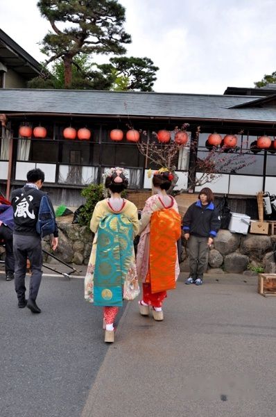 这是在岚山旁边的艺伎,从服装到头饰都很华丽,妆容有些夸张的白。