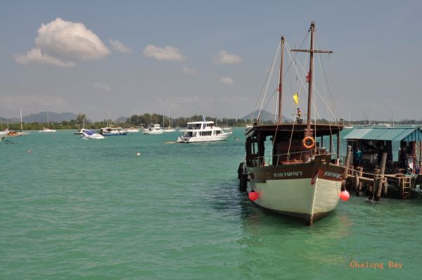 近11点时,顺路牌拐到Chalong Bay,多么中国化的名字:长龙湾。海水呈乳蓝色(呵呵,没恰当的词),有长桥引申入海,多个分叉可停大小船只,虽然不是浴场,也非常漂亮,这海水真想从桥上跳下,融入她怀抱。这儿就有小巴拖着游客来乘船,应该是前去皮皮岛的,各色的大小船只,还是挺诱人的!
