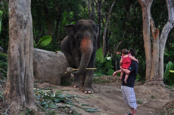 这些是跟团游无法体会的,这些景点也是大家不大知道的,但让你更多接触当地人。。。吃完收拾干净,继续奔往普罗善角。道路渐渐进入山区,树荫蔽日,凉快了,下坡不敢冲,上坡骑不动了。推吧,也比背包走轻松。自去年在柴达木首骑以来,爱上了自行车,但是还没学会怎么摇上坡,下坡时这儿路窄弯多又不敢不带刹,上坡忍了推吧,多的就是时间了!推多了就琢磨这大行老板告诉我的摇上坡的技能,不时就骑骑,还是不得要领,累坏了。就看到前后两辆鬼子徐徐地摇上去了,我不着急上火啊,换20年前,咱哥们一样!换你丫的20年后来骑骑,体型估计赛皮球了,想滚上去也得费大劲!这样方便拍照了,累了就停下喝水拍照,还遇到锁链的大象,一鬼子带着毛娃骑小鸟前来,喂它吃长根甘搾。大象面对你时,你就不得不后退,太大了!还有泰拳馆,吸引着年轻的白人,这些娃就是好奇心大,他们才是当地人喜欢的消费者,在庙里你一样能看到他们扑倒长老前,认真合十瞅着长老给他念叨。大菩萨大神仙我早不羡慕了,我就到处走走玩玩的自由人!