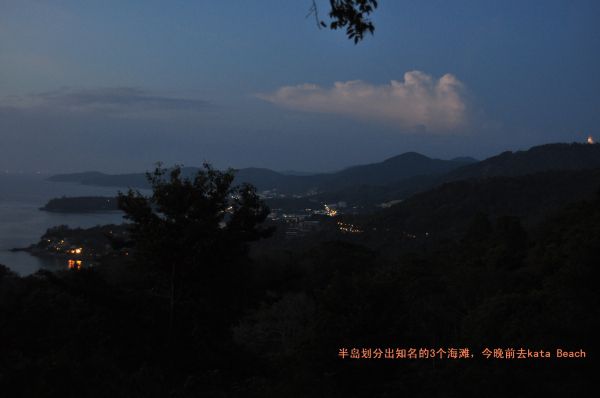 今天将在kata Beach过夜,盘桓到另一个山头时,天幕已合,下方一个个半岛环抱的海湾已经灯光闪烁,有国人遥指第二个弯:kata Beach。好在一路下坡了,溜过去,很热闹的小镇,要赶紧找到网上推荐的一家guesthouse。