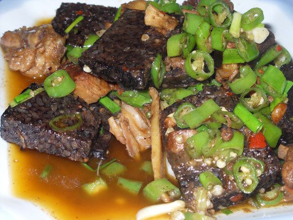 我虽然一个人玩,但我还是点餐吃饭了!所以知道它是怎么制作的:用鸭血跟糯米混在一起煮熟后下锅稍未油煎其表面就成了“血耙”,鸭肉切开一块块炒一会儿后再加入辣椒圈、“血耙”混在一起爆炒,哈~~~就成一道特色菜了!我吃的门店叫啥?忘了~~~(反正到处都可以见饭店有这道菜,18——48元不等)我尝后觉得还可以,“血耙”吃了几块觉得很腻,因为多油呀!鸭肉吃光,辣椒一点也没碰,因为我怕辣和上火呢!至于“血耙”具体怎么制作,整道菜如何烹饪才有其特色,这个我就不研究了~~~其次,最为特色的菜应该就是酸汤鱼、腊肉了。苗家社饭——通常是以社菜、野葱糯米、土家腊肉混着一起煮那种。在街边小摊,你会见到很多卖油煎白豆腐的、油炸豆腐或者小螃蟹之类的,本人对那些没兴趣,也不敢去尝试。